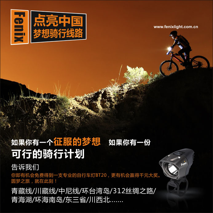 在每位骑行爱好者心目中都有一个征服的梦想,都有一条魂牵梦绕的骑行路线。如果你在未来有骑行梦想,有一条可行的骑行计划,向Fenix官方申请,即有机会得到由Fenix免费赞助的BT20双光斑自行车灯一支踏上梦想的征程。