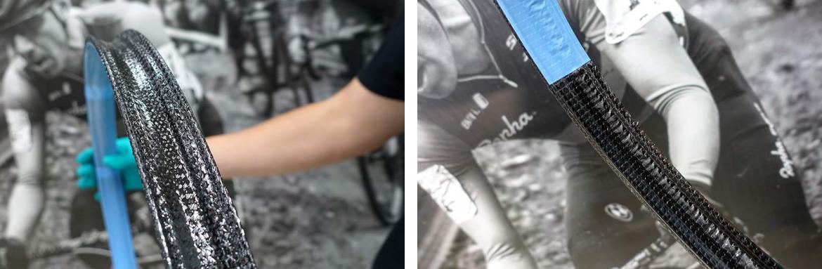 首先用模具夹住边缘,这种塑形方法使得碳纤维的分割线在轮组两侧,避免分割线出现在轮组的主要受力点。之后用磨砂工具打磨碳纤维表面,别担心,不会伤害到碳纤维主体。