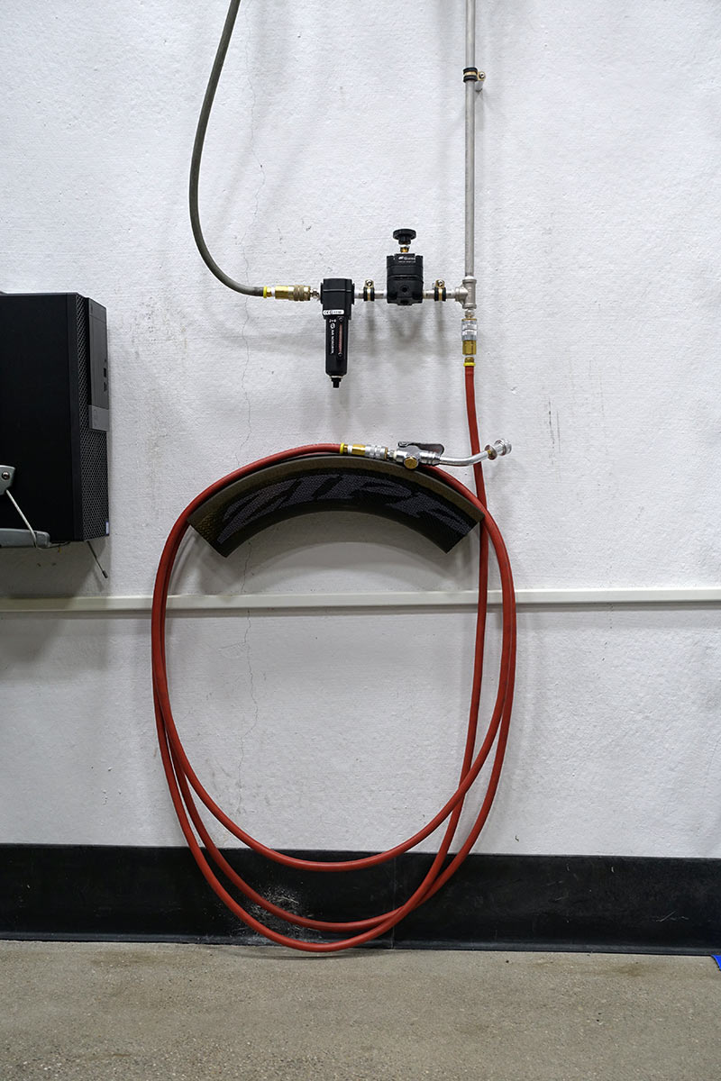 为了测试轮辋的抗冲击能力和工程学柔韧性,ZIPP使用了几台不同的机器。应厂方要求,这些机器我们只能透露部分。有很多东西他们不想公之于众,其中之一是一个真空胎密封胶安装机,它通过翻转和滚动车轮,均匀地将密封胶分布在整个轮胎内。这目前还是一个商业秘密,如果你依靠胎压来测量一些数据,确保密封胶均匀地分布在胎内是很重要的。 ZIPP花费了数万美元购买这台机器,仅仅是做人工都能完成的简单工作,目的是让胶涂得更均匀,可能是ZIPP的老板有强迫症吧!