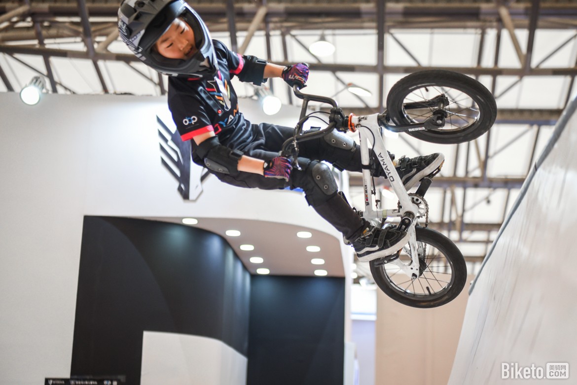▲小车友来RST展位打卡,据说他是国内为数不多玩速降的小朋友之一,用的就是RST前叉,小家伙一看就有冠军相