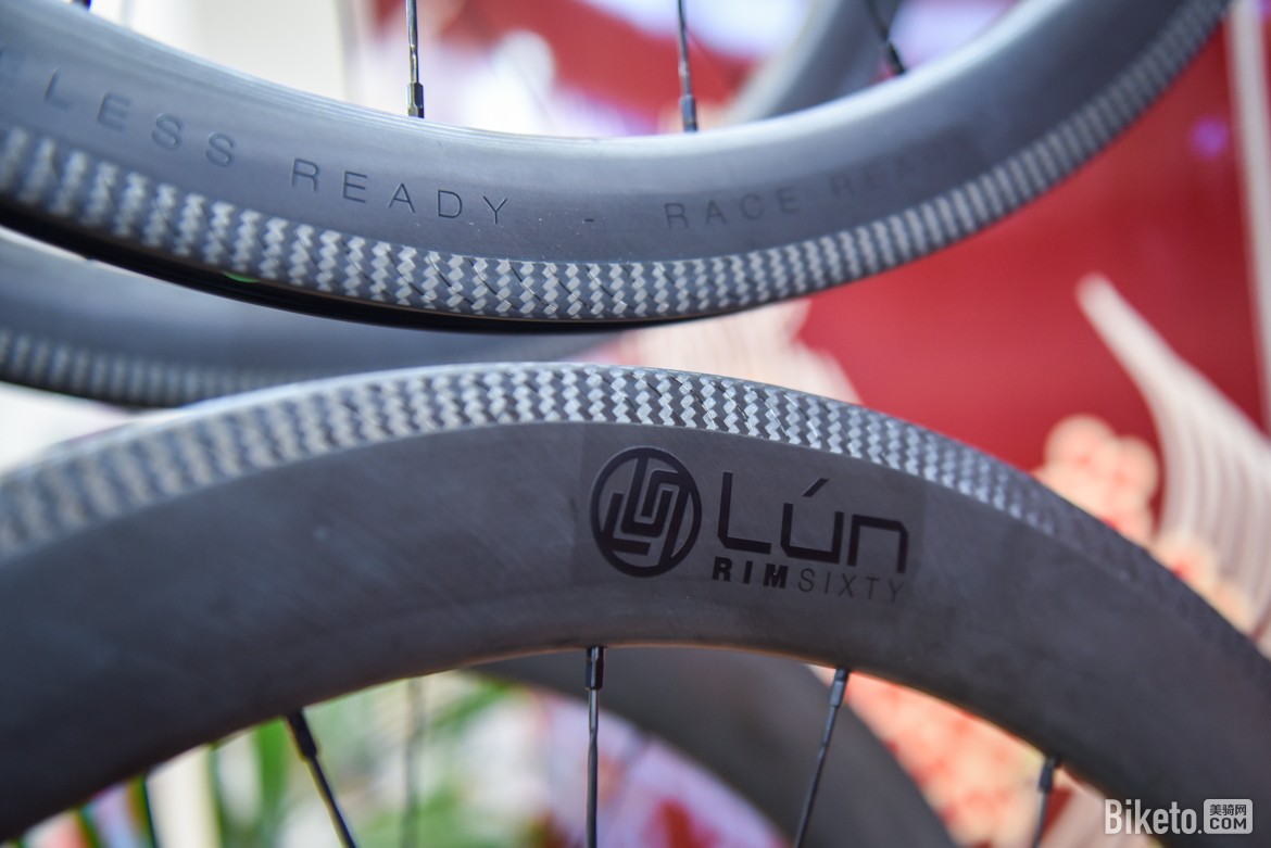 ▲富律业展位展出了LAMINAR APRISA风速全内走线碟刹公路车架和众多公路车弯把、铁三/计时把