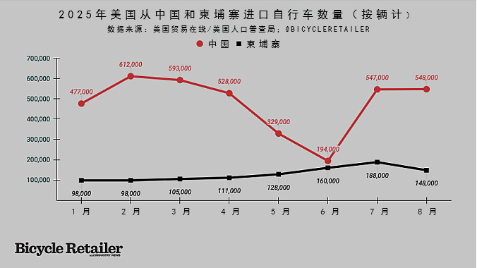 6月份,美国从中国的自行车进口量同比暴跌42%,因为自行车行业将目光转向了柬埔寨,寻求更佳的替代选择。柬埔寨甚至超过中国,成为截至6月份美国最大的自行车供应国(按美元价值计算)。