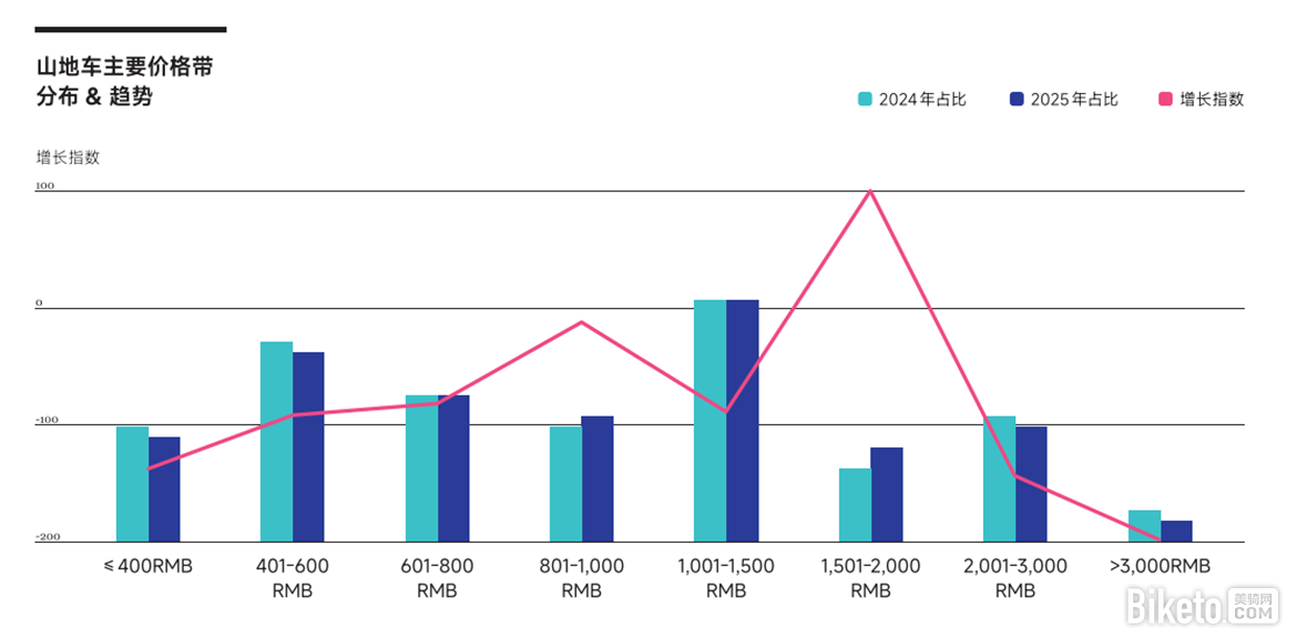 在经历公路车热潮之后,2025年线上整车市场结构出现明显调整,用户的车型选择偏好逐渐多元化、场景化。山地车运动在青少年人群中的参与热度提升,呈现年轻化趋势,并凭借全地形适配性与高实用性,重新夺回"最热销车型"宝座。