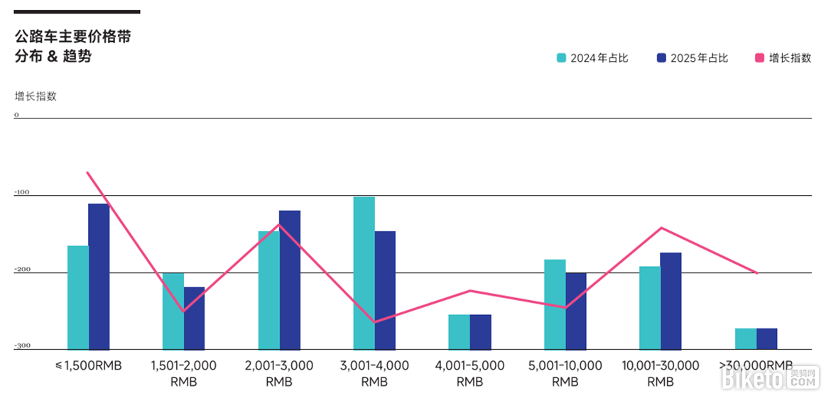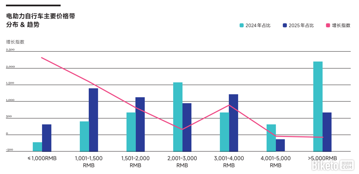 从预算分布来看,山地车用户的预算区间集中在1,500元以下,公路车品类呈现"双入门"发展态势。折叠自行车用户的购车预算延续上移趋势,电助力自行车市场在新品牌带动下快速增长,目前需求集中在1,000-2,000元的入门级价格带。