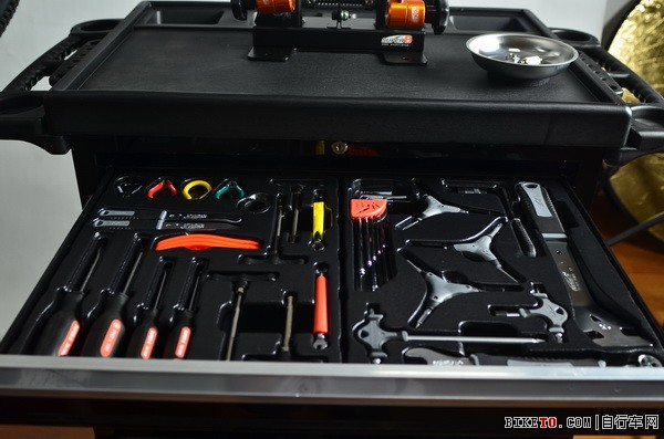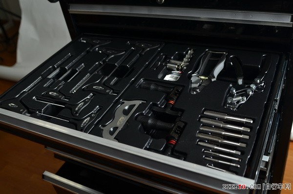 日前,鑫振发商贸有限公司为BIKETO自行车工作室赞助了一套价值不菲的SUPER B专业修车工具豪华套装,该套装几乎涵盖了所有自行车修车工具,是一套非常具有实用价值的产品。该修车台一共有六层,每层里面都装有各种不同的维修工具。同时还有一个独立的自行车修车支架,可以轻松的把自行车挂起来,方便维修,同时又大大节省了占地空间。