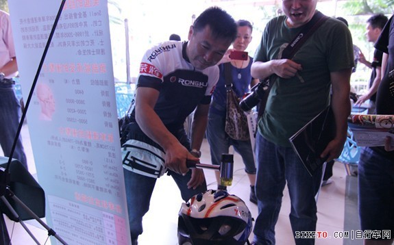 组办这次活动的鸿祥自行车行迟总亲自体验头盔检测仪,吸引很多的观众现场围观。