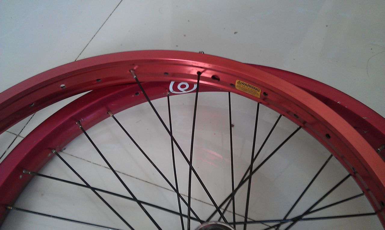 注意:关键要把辐条放到新圈上对应的辐条孔里面,然后把辐条帽拧上,下图中可以看见有两根辐条已经到新圈里面了。