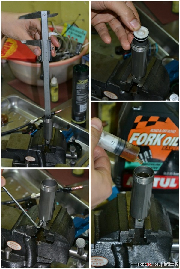 将IFP活塞放入油缸内。(每个密封圈都必须涂上阻尼油),IFP气室的深度设定,将下端的气嘴用六角匙扭紧。注入阻尼油,我用的阻尼油黏度为10W。