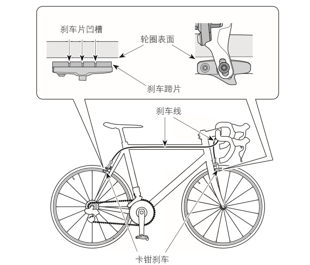 将刹车块安装完成时,应保证刹面与轮圈表面平行,刹车块上沿弧度与轮圈弧度呈同心圆,如果在安装时出现了错位,很容易引起刹车片的不均匀磨损,降低使用寿命并有可能危害骑行安全。
