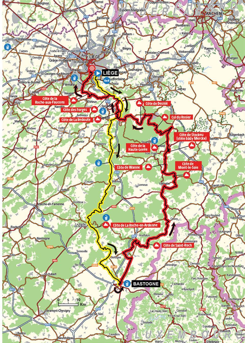 赛事路线。比赛从比利时第三大城市列日出发,一路南下到(比利时、卢森堡边境城市)巴斯通后再返回列日,比赛赛程258公里。选手们将挑战途中10座(5%-12%)左右坡度,坡程1-4公里不等的山,总爬升超过4000米,路线多为密集短陡坡,小集团冲刺对决收尾。对于选手的上下坡能力和临近终点前临门一脚的能力有极高的要求。参考近四年前三名选手,要么是大环赛总冠军选手,比如埃菲内普尔、罗格利奇、波加查;要么是队内顶尖多面手,比如阿拉菲利普、范阿尔特、戈杜、范德普尔等。