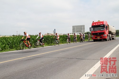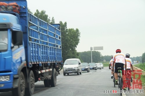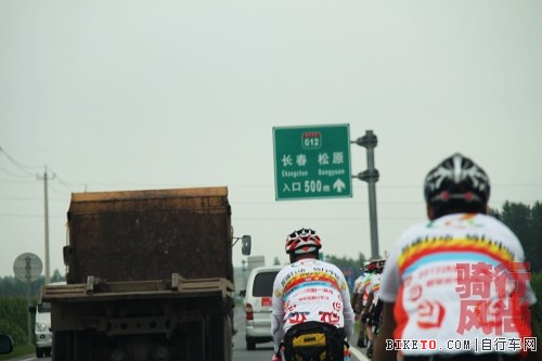 出了长春市区,进入国道,道路就变狭窄,机动车特别多,后勤人员,不断地提醒队员注意安全,提醒机动车辆让行车队,保证骑行队员安全!