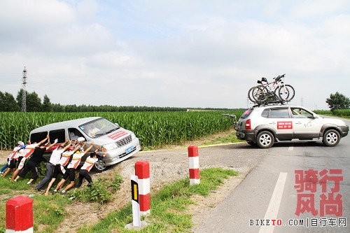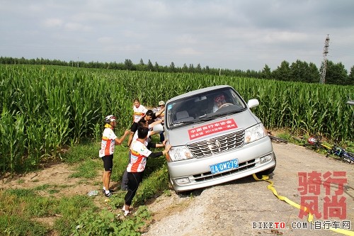 今天最惊险的一幕,为了拍摄一组好的记录片给大家,队里的摄影车不慎滑入软土中,后勤人员和队员们齐心合力把车抬出来了,有惊无险。骑行队里的每一名人 员,都在为这次长途骑行宣传活动,默默的奉献着他们的爱,对生活的爱,对自行车的爱,对自行车文化的宣传、奠基,在做着踏踏实实的事!