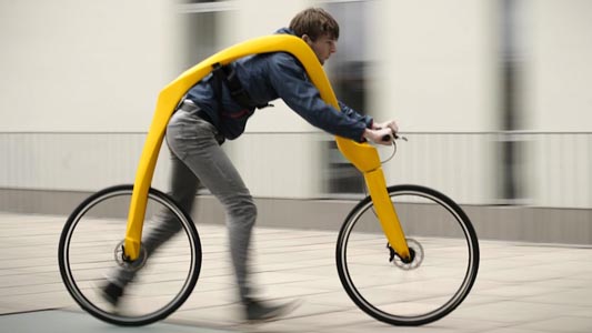 据说,Fliz Bike的设计理念来自于1820年。在当时的庆典中,经常会出现一种由人假扮的骑士,看上去威风凛凛,其实完全靠自己的双脚在走。Fliz Bike不仅没有踏板,甚至连坐垫都没有。两个轮子靠着一个“马具”相连,而为了保持平衡,骑车者则是被拴在这个“马具”上,靠着自己的双脚去“驰骋”。