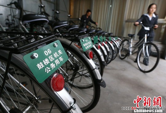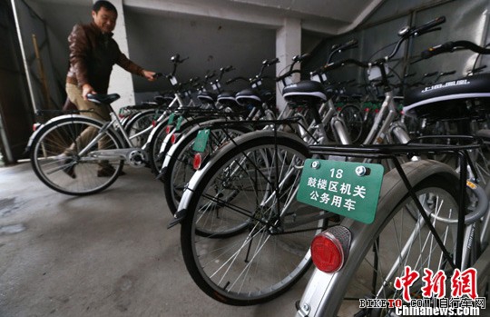 11月1日,南京市鼓楼区政府的一百辆新配备的公务自行车亮相,后座上的绿色标牌“鼓楼区机关公务用车”和车号醒目得标明车辆和车主的身份,不仅成为公务员短途办公、绿色出行的首选,同时节约成本,也方便接受市民的监督。