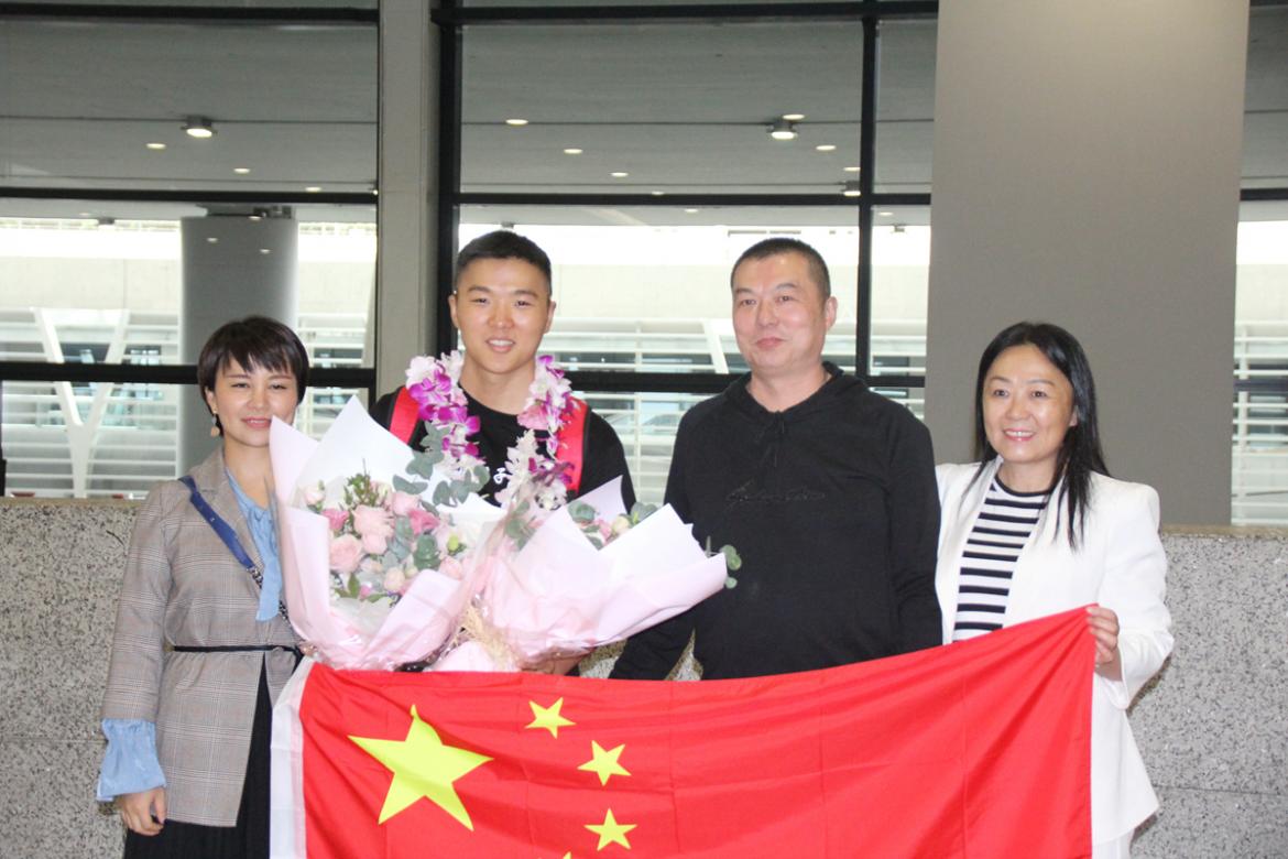 看到浩然从到达口推着行李走出来,英雄一般笑着,大家挥舞起手里的小国旗走向前,引来大厅众人一同为他欢呼。浩然的女友和父母首先为他送上鲜花和拥抱,不言而喻的幸福洋溢在脸上。朱总和到场赞助商、好友一一为浩然戴上花环,拥抱合影留念,表达内心的感恩和激动。