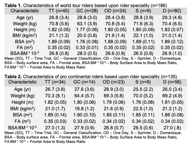 此项研究比较了710名职业车手,旨在探讨世巡赛车队(WT)和职业洲际队(PC)车手身体特征差异。排名前25%的选手被选为样本组,在不同测量类目上(除年龄外,即身高、体重、体表面积等)发现两者之间的测量差异,来确定不同类型专业车手的具体特征,以及在专业范围内差异,这可能决定了车手何时可以从洲际队转向世巡队。