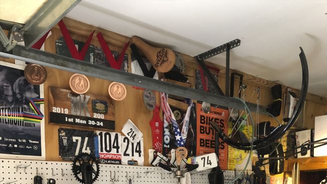 ▲为了向他的骑行生涯致敬,Strickland的工作台被Red Hook(红钩赛)奖牌和DK200牌匾挡的严严实实