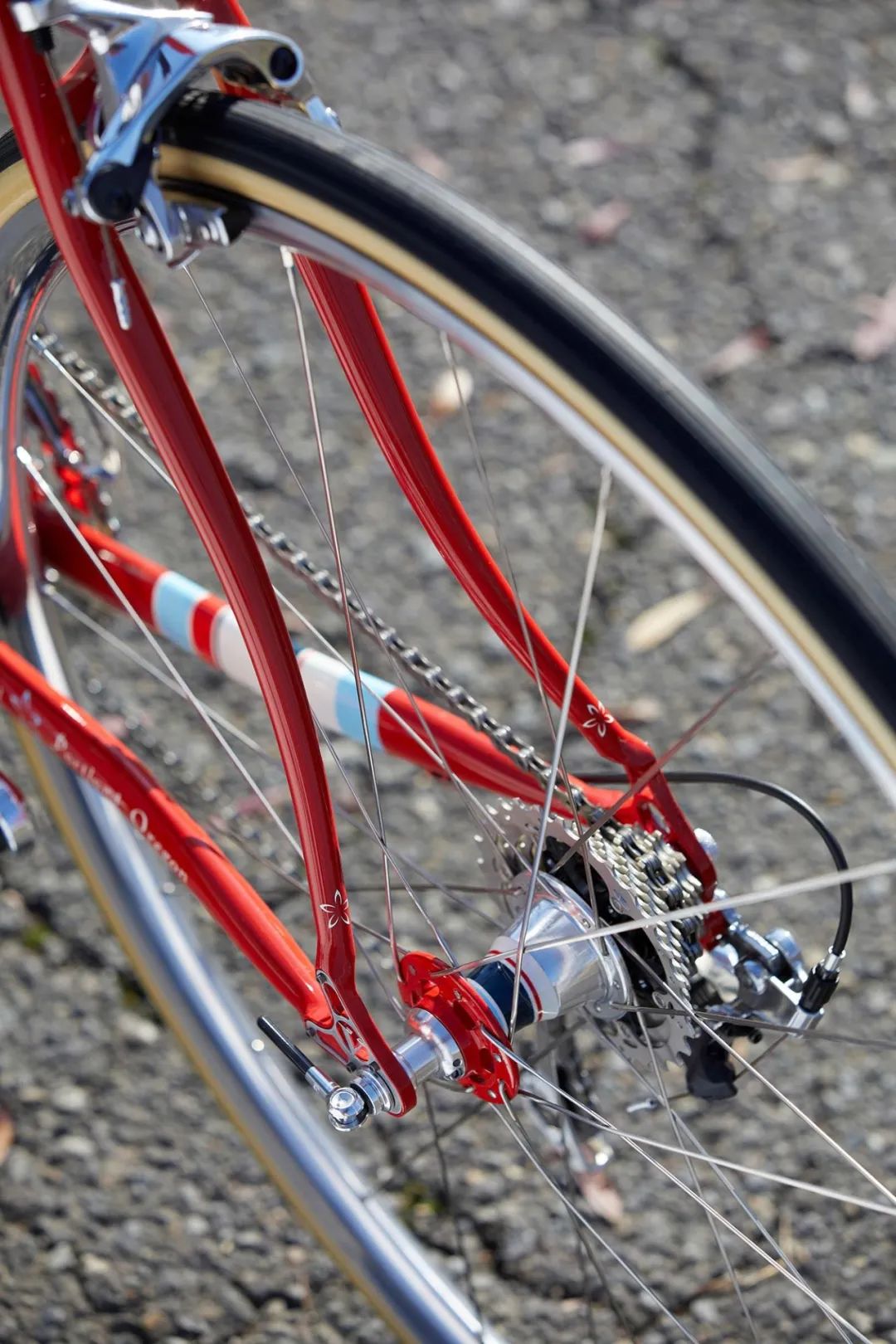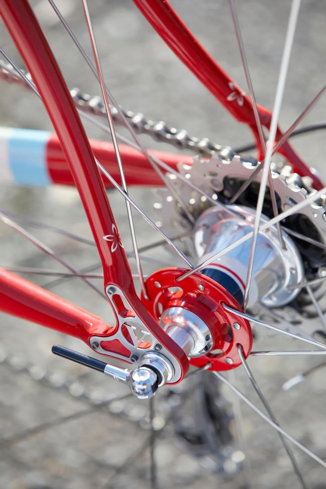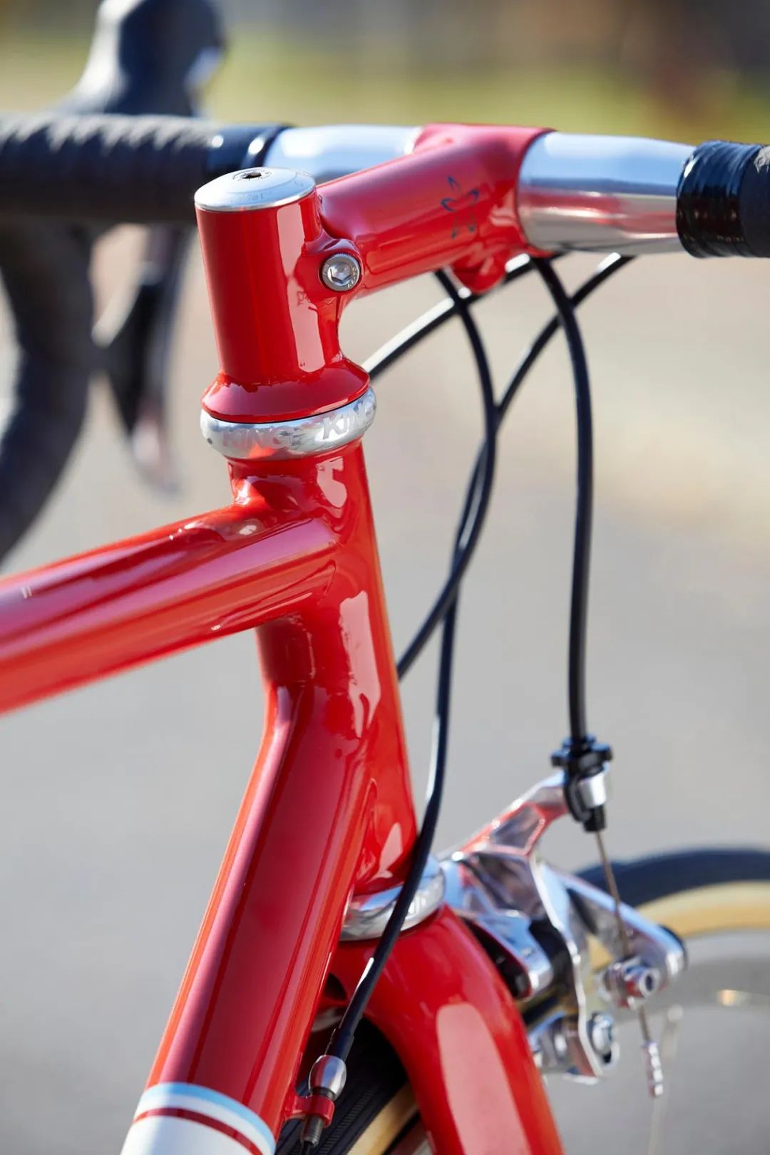 前叉和碗组使用了与钢架车绝配的ENVE碳叉和Chris King碗组,有意思的是香草并未使用市面上销售的把立,而是特别设计了一款与上碗组盖融为一体的把立,并做了车身同色烤漆,这也是手工车的个性化魅力所在。