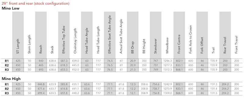 在前29"后27.5"混搭轮径的鲻鱼模式时,Mino设置在高位(High Postion),车架几何非常接近前后29"轮径时Mino设置在低位(Low Postion)的车架几何,只有一两毫米的差异。