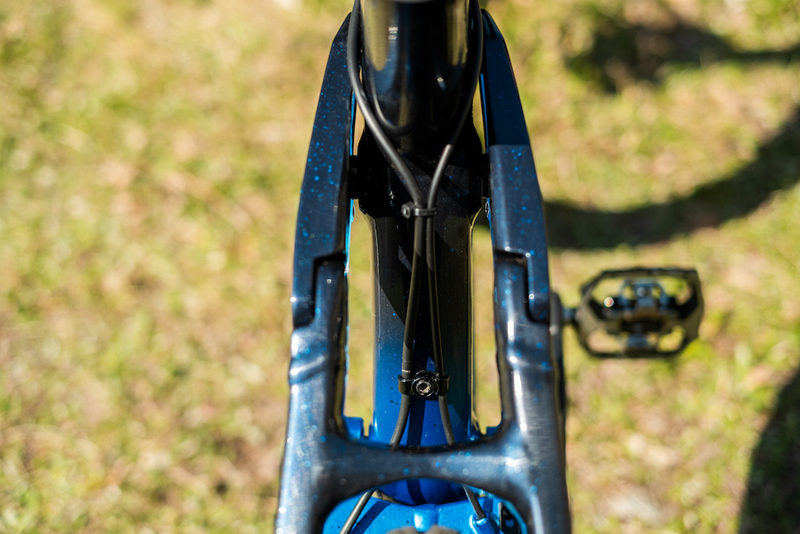 车架走线有两个方案,一是车架前三角上管可走内线,在接近立管时,刹车线和变速线由上管穿出通过立管,这时外走线到后刹车,到后拨又是走一波内线。二是外走线,在车架上管下方有固定线管的线扣。有的车手喜欢走内线的简洁,而有的车手喜欢走外线的维护便利性,所以这两种解决方案让大家皆大欢喜。