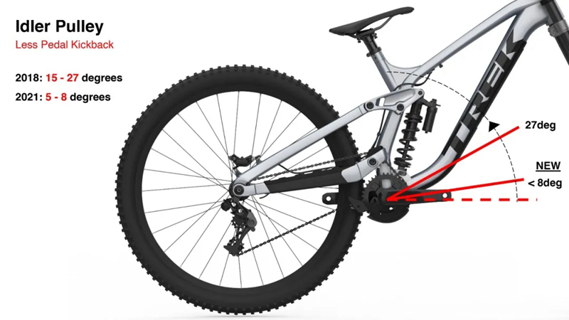 Trek的历史上已经有很多车都采用了高转点悬挂系统,虽然从来没有来自链条拉伸的定位问题,但得确保主转点不要太高,这个位置的布局设计也是推动研发新款Session的一个因素。转点太高了后轮轴轴心避震动作时的弧线开始变得完全靠后,通过加入一个张紧轮改变链条的几何形状,从而带来更少的踏板回击。