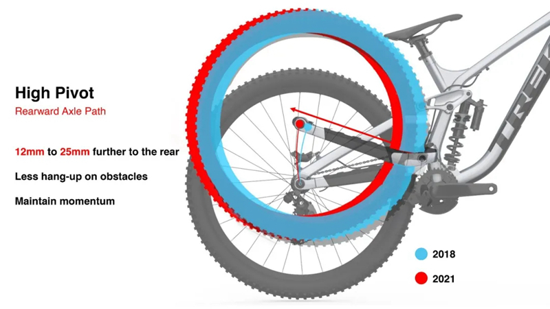 新款Session高转点设计确实使后轮轴轴心在做避震动作时更靠后,对标老款Session多出12至25毫米。从后轮轨迹来看,很明显,Trek限制了它们的高度。这意味着在应对震动时后轮向后移动的位置更多,在增加抓地力的同时,高速下坡更稳定,并在大震动时带来更好的支撑性,还没有后轮碰到坐垫的尴尬。