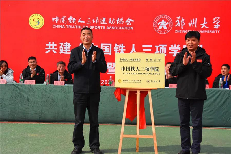 中国铁人三项运动协会秘书长陈笑然与郑州大学党委副书记吴宏阳,签署合作协议并揭牌。中国铁人三项运动学院的设立,是在深化体育改革的大背景下推出的一项重要举措,对新时期中国竞技体育运动项目社会化发展将起到示范作用。