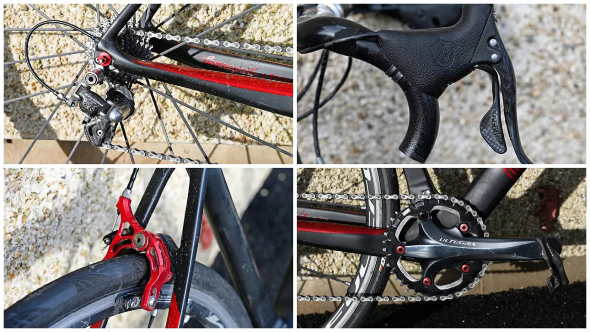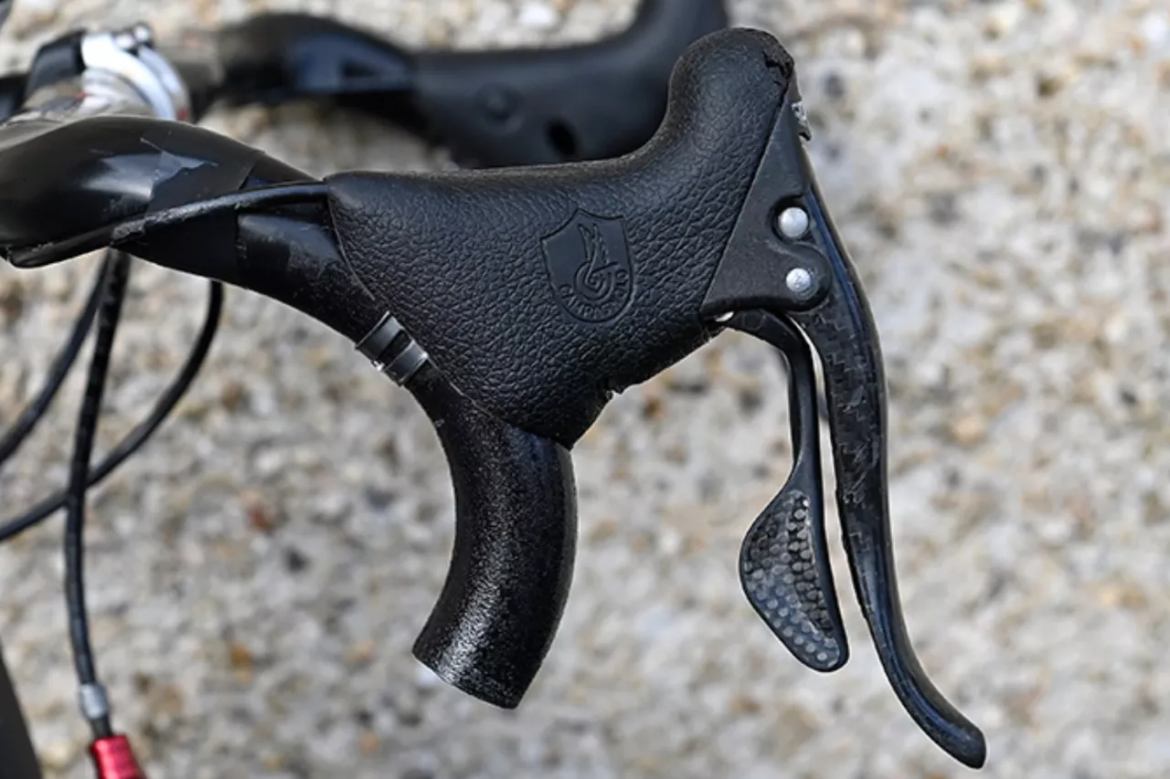 战车的传动系统由多个品牌混搭构成。车上基本见不到顶级套件的踪影。Brithja Jones选用Campagnolo手变搭配Record短腿后拨。