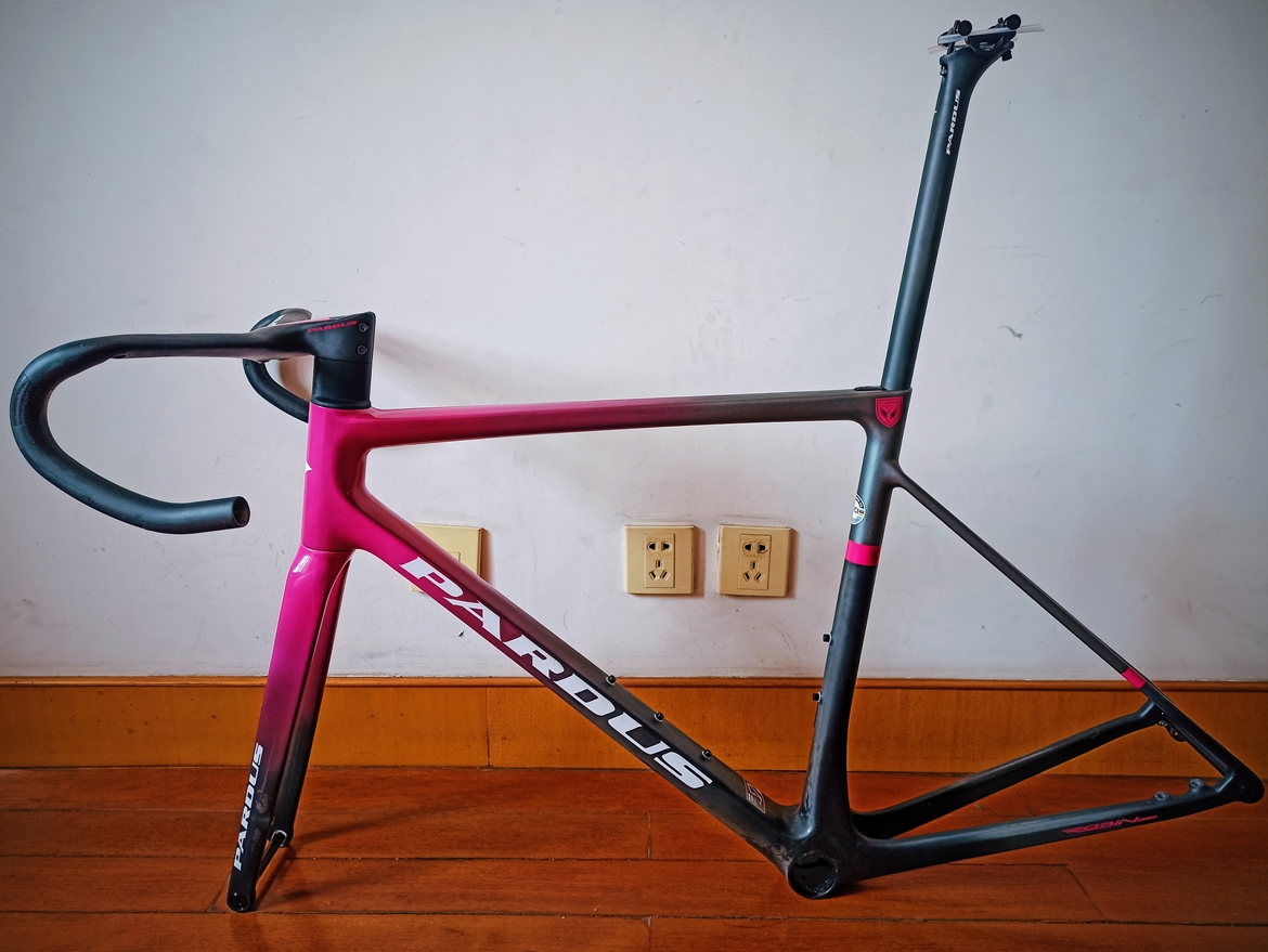 首先这是一支定位顶级的全内走碟刹综合车架,全车没有任何外走线开孔。车头存在一定的气动设计,但后部仍保留了圆管设定,卖点是高整合度、简洁的外观和750g的车架,有很深的性能潜力。