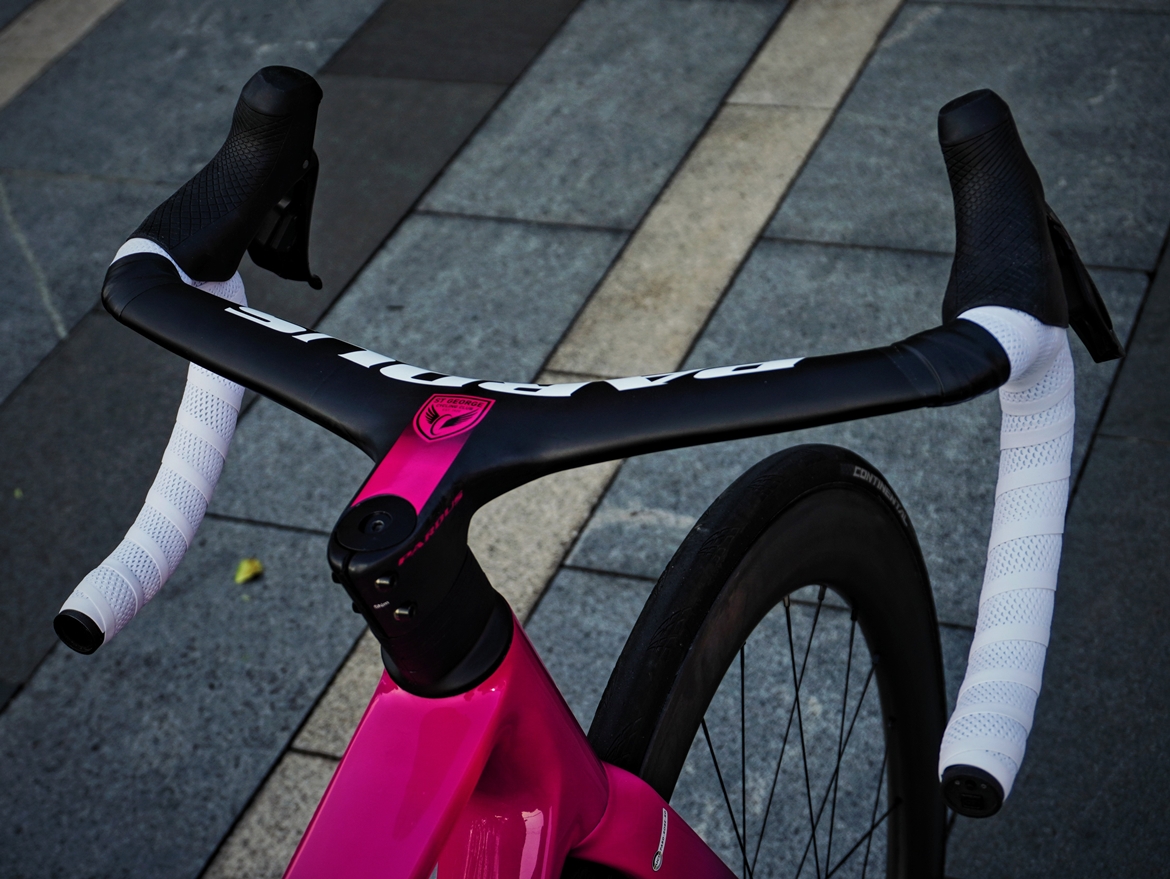 车把造型和宽度方面,全系提供了2cm的外撇,但上把位的握感(抬升倾角)和下把位的弯型对比起用惯的sl 70 aero,摇车时属实有些不顺手,不过扳回一局的是它300g的重量所提供的上下把位刚性,个人认为比较优异。