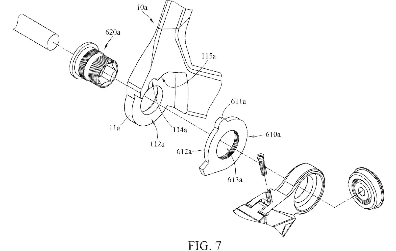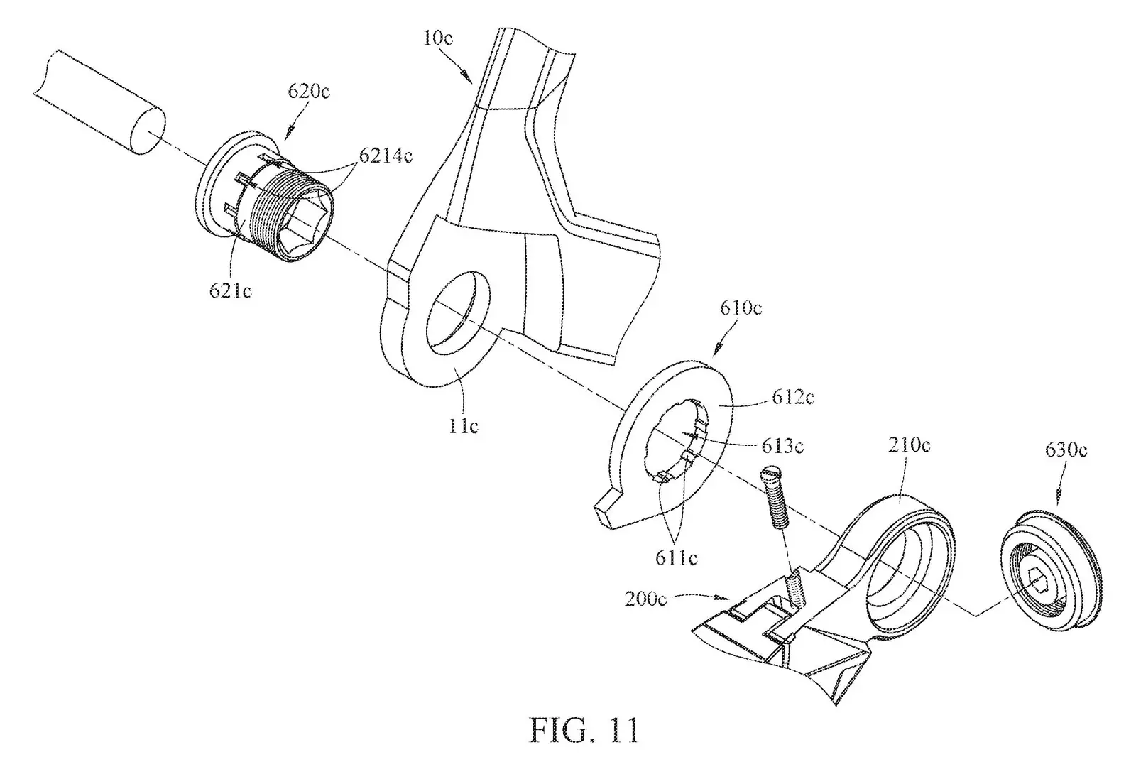 参考图11,TRP提出的直装解决方案使用三个独立的组件;衬套(620c)、适配器(610c)和紧固件(630c)。该系统和SRAM系统之间的一个显着区别是适配器(或滑块)的放置,在TRP的变速器上,一个滑块位于变速器和后叉之间。在SRAM系统上,此滑块位于后叉的内侧。无论哪种方式,它看起来仍然允许变速器在从前面受到重击的情况下顺时针(向后和向上)旋转。