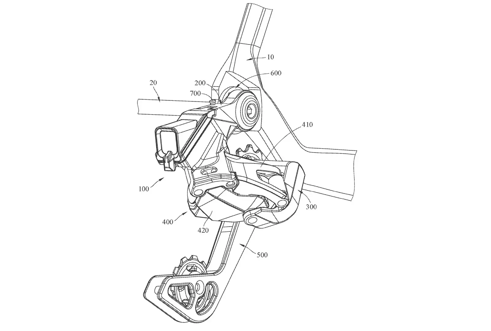 该专利写道,“可以提高自行车后变速器的稳定性,使自行车后变速器能够抵抗冲击或撞击”。这与刚刚提到的安装在分体尾钩上的新传动系统形成对比。这一切听起来很熟悉对吧?事实上,自从SRAM UDH的出现和随后推出的Eagle Transmission以来,似乎每个人都想参与直装后变速器的设计。