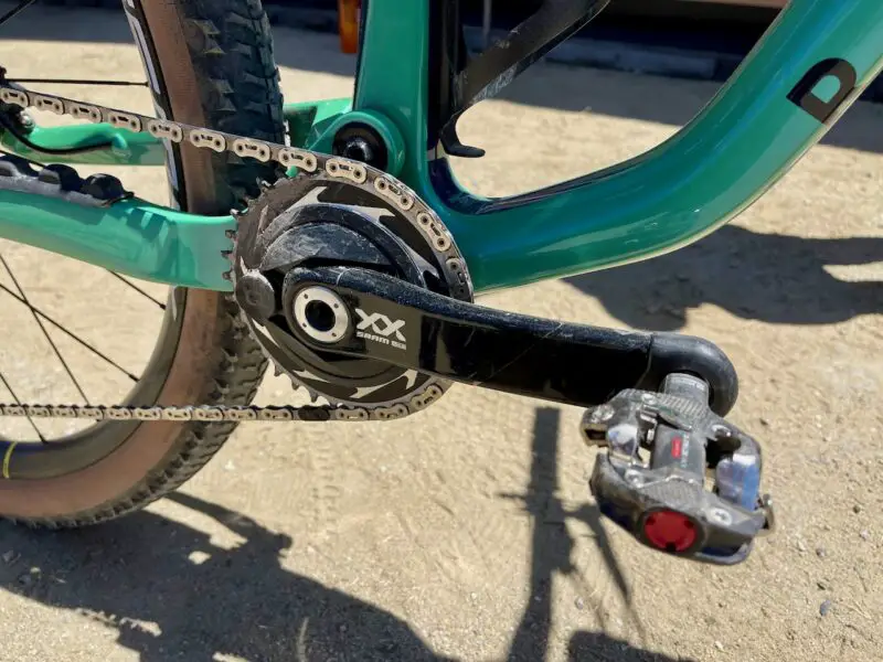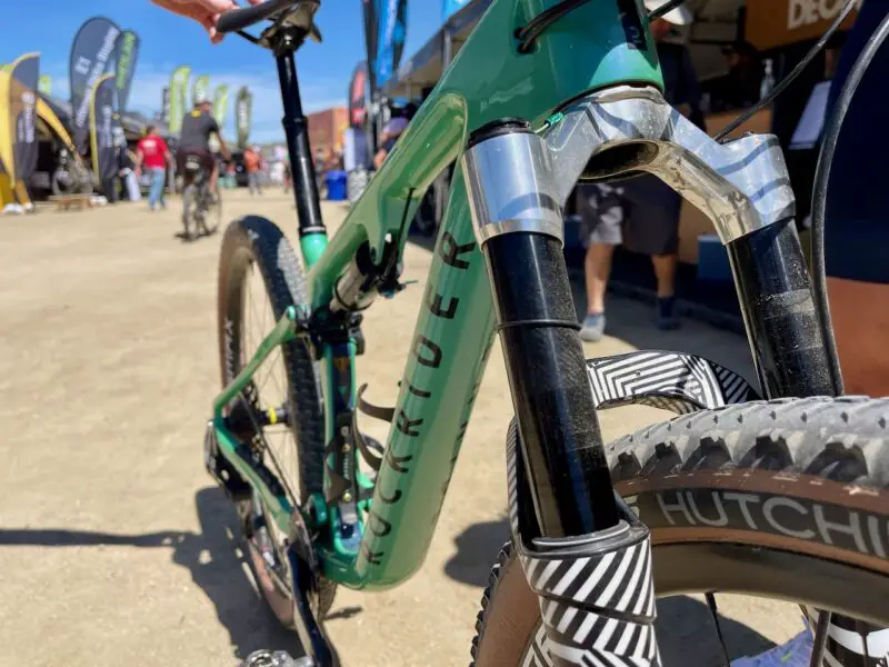 前叉和后避震上带有伪装贴纸,显示出这是一些原型产品。和后避震不同的是,前叉处处贴着原型贴纸,隐藏更深,据外媒所知,它是当前Manitou R7 120mm前叉的加强版。
