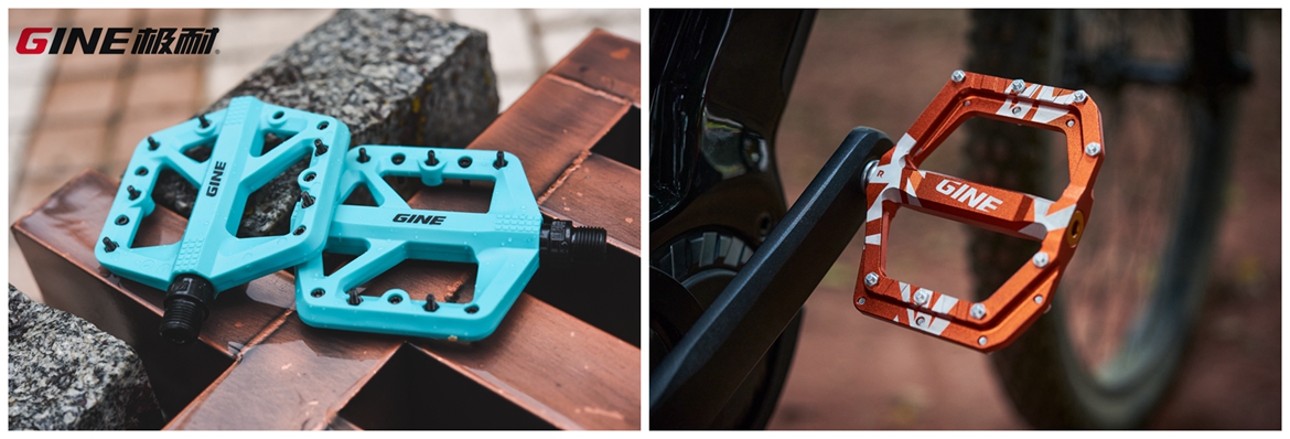 ▲专业自行车零部件品牌GINE极耐脚踏,铝合金、复合材料与锁踏多个系列,每款色彩鲜艳丰富,耐用防滑