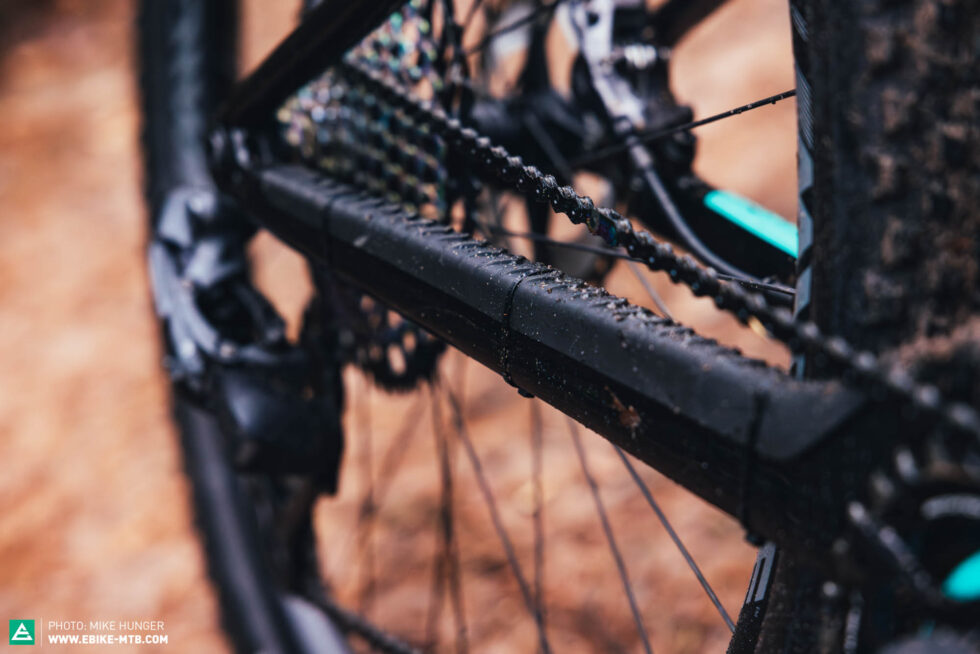 除此之外,还有所有到车架中的杂乱的电缆走线。由于车架和碗组都没有任何形式的转向定位器,因此车把可以自由转动到足够远的地方,以致于在发生碰撞时,变速线或前叉锁死线控线管会碰到并划伤车架上管。由于采用了大尺寸的后叉保护贴,后下叉得到了更好的保护,并使链条保持安静。
