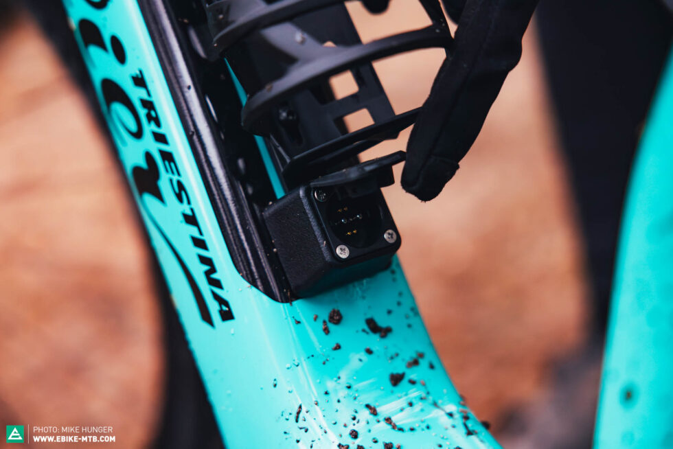 下管具有熟悉的曲棍球杆形状,这要归功于FAZUA Ride 60,它是Wilier Urta Hybrid的核心。电机输出扭矩为60 Nm,在标准模式下支持高达350W的功率,在Boost模式下短暂提供高达450W的功率。FAZUA Ride 60由永久集成的430 Wh电池供电,并可加装一个210 Wh外接电池。外接电池尚未上市,但将来应该会上市。得益于宽敞的前三角,车架可以容纳外接电池和水壶。电池的充电口位于下管的水壶架下方。然而,将橡胶盖打开足够空间,让充电器插头可以插入是非常棘手的,尤其是在水壶架中有一个水壶的情况下。