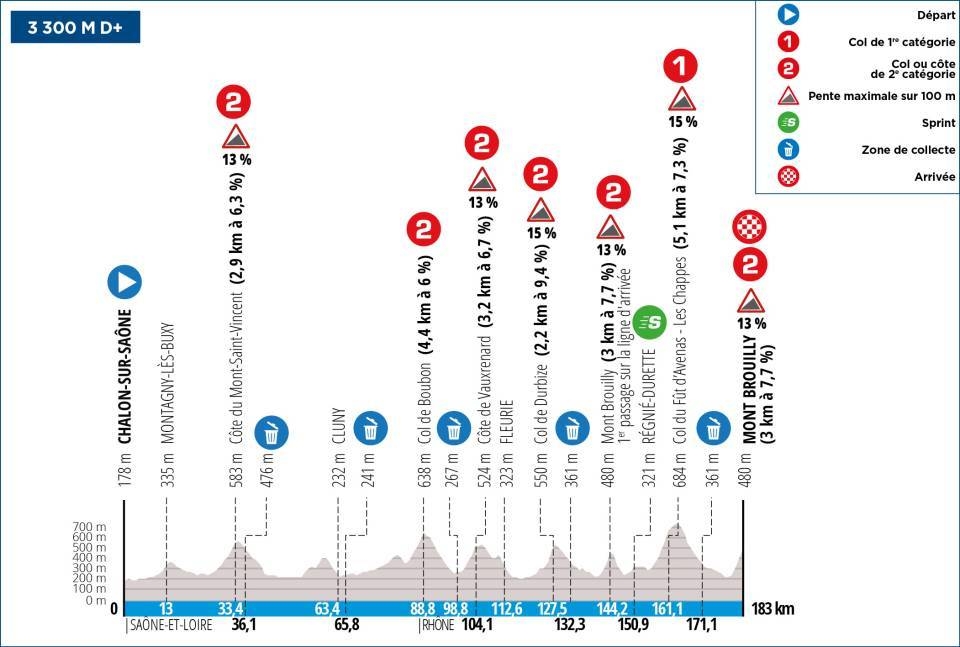 赛事路线。本场比赛赛程183公里,从沙隆出发一路南下,途径7个爬坡点和1个冲刺点。对于擅长山地丘陵选手而言,有机会借助后半程多处短陡坡拉开和主集团时差,从而实现单飞致胜戏码。