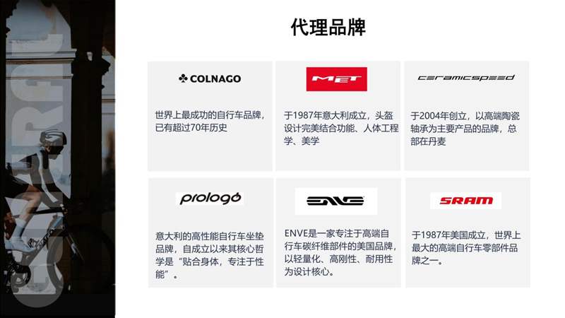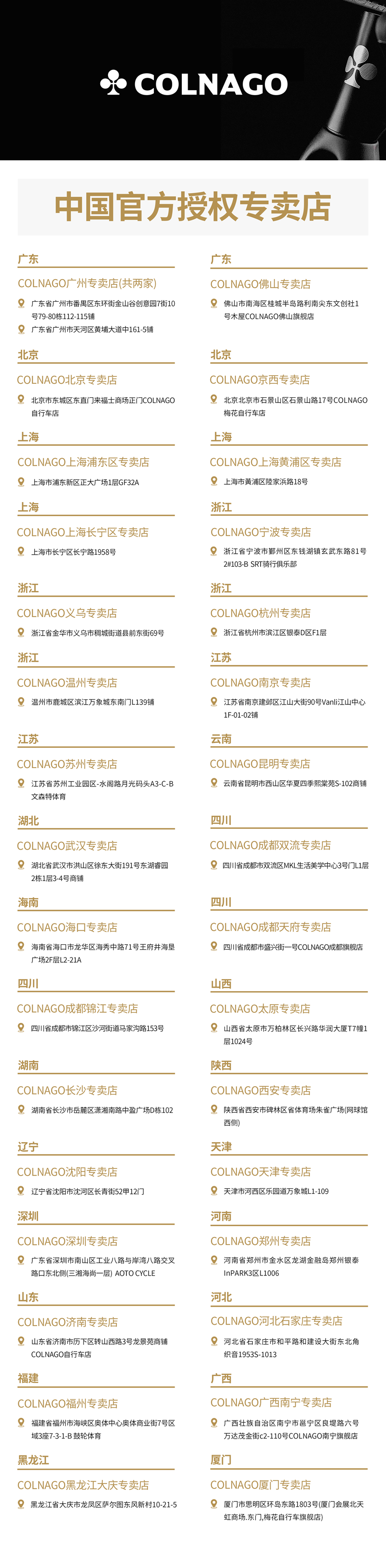 COLNAGO 中国独家总代理广州赛竞贸易有限公司,超过10年高端自行车产品销售及品牌运营经验,持续为合作伙伴带来优质的产品,服务以及盈利机会。