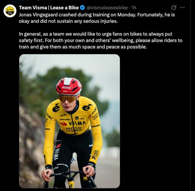 维斯玛-租赁自行车车队通过其社交媒体确认了这起事件,并希望就车手状况发布安抚信息。“乔纳斯·温格高在周一的训练中发生摔车。幸运的是,他情况良好,没有受重伤,”这支荷兰车队通报称。