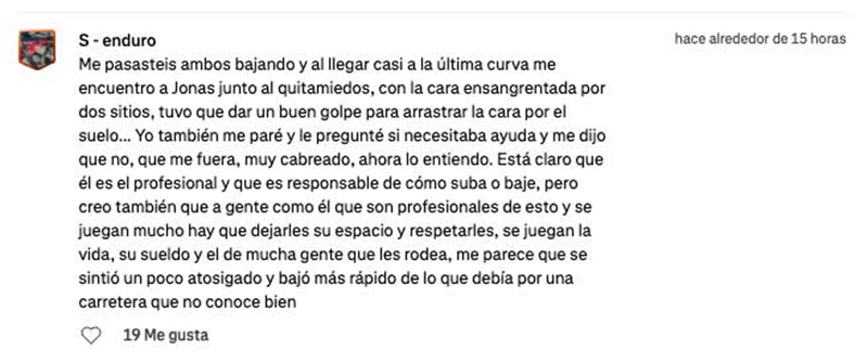 跟随温格高的业余车手佩德罗·加西亚在Strava上发布的活动记录中解释了在他看来事件的经过。他在这条社交媒体上的原文叙述如下: