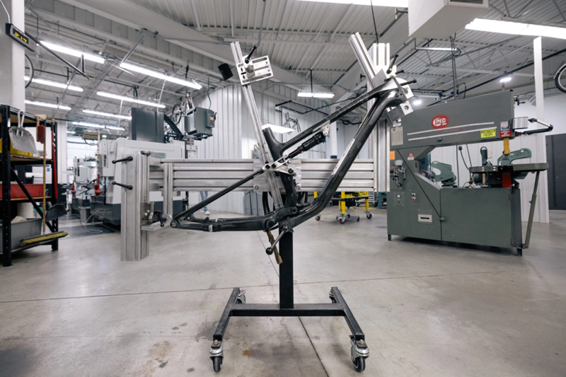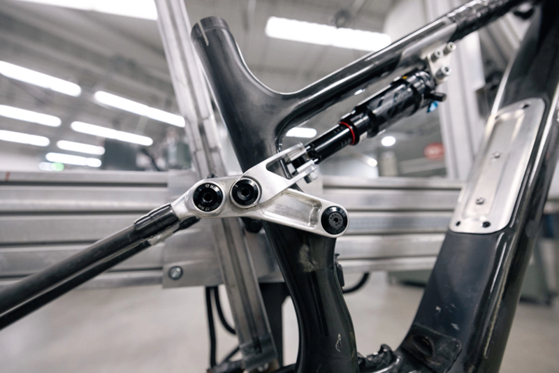 经过几次测试后,团队选择了一种带有传统连杆的设计,该连杆驱动位于上管的避震器。这个系统在整个行程中提供了非常渐进的特性。