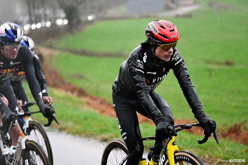 从里到外地说,这个搭配方案确实有点复杂,最里面是一套正常配置:打底衫加上连体服,这是职业自行车手的基础着装。它们符合空气动力学,快速高效,但在恶劣天气下没什么灵活性。连体服过于紧身,也意味着里面不能再加衣物。温格高只有一个选择:往外穿。往上叠,一层比一层更大。