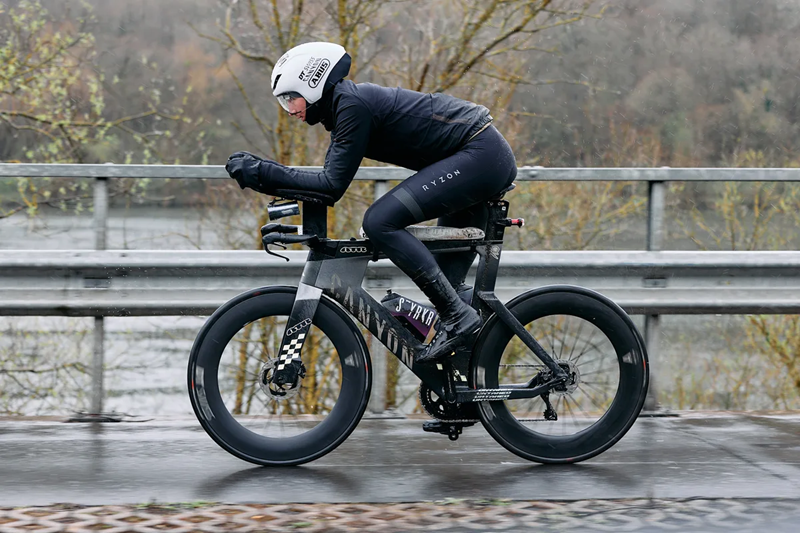 麦科马克全程骑乘一辆定制的Canyon Speedmax CFR计时赛车。这辆车的配置更接近精英铁人三项赛车,包括高堆空气动力学前部、集成水壶、激进下倾的座垫、Exposure车灯以及一个上管包。