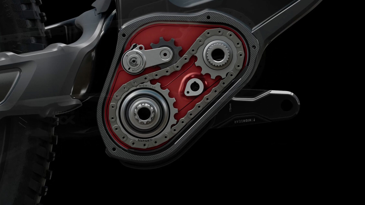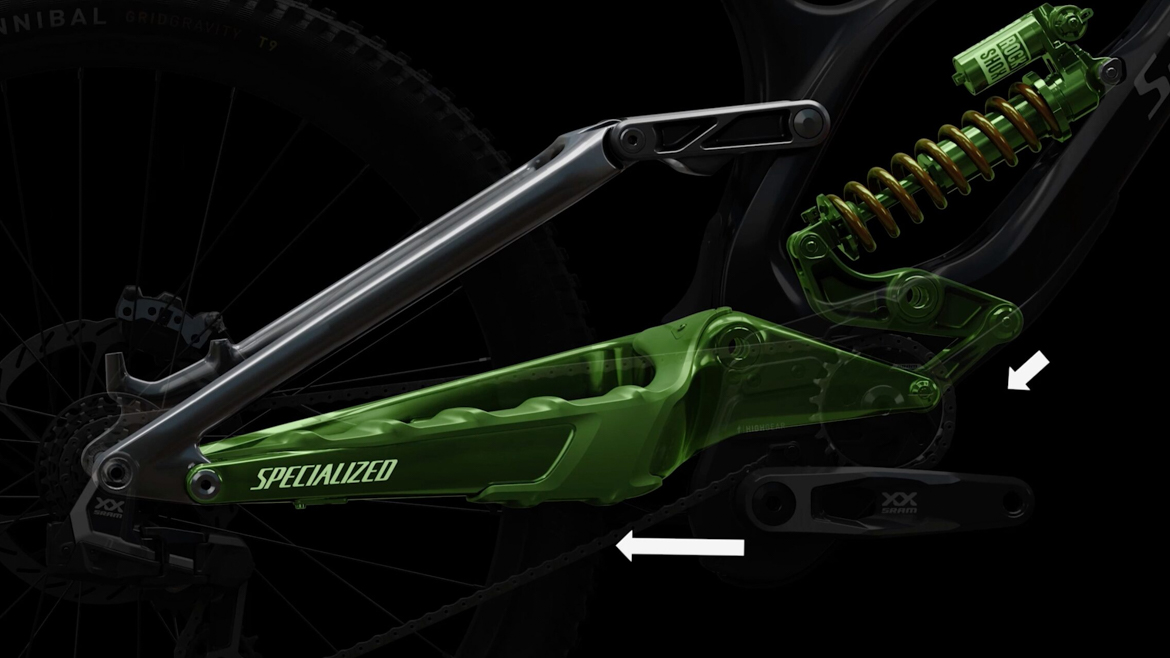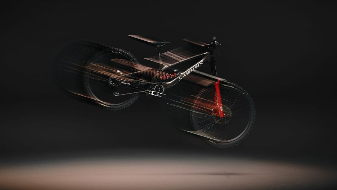 闪电正式发布全新一代S-Works Demo 11,新车耗时三年联合World Cup冠军车队研发,核心是OBB五通上方悬挂连杆与HighGear独立传动系统,将避震和驱动作为一个系统去调整,将200mm行程速降车的离地间隙提升30mm,主打“高速稳定、零踏板回击、精准操控”。与SRAM联合研发的HighGear系统,采用小驱动环+中置传动轴+高位终传环的“类变速箱”布局,能很大程度提高离地间隙,并且让链条压力与避震行程解耦,彻底消除踏板回击。采用Horst Link四连杆和额外驱动连杆的OBB,让车架有24%渐进性,兼顾长行程支撑与中段灵敏响应,后轴在100mm行程时后移约13mm,能够有效的化解冲击,提升过弯的稳定性。几何可多处微调,头管角度62.5°,碗组可实现±6mm的Reach值调整,五通倒装芯片可调节7mm高度,最低为348mm,最高为355mm ,适配不同赛道与车手习惯。车架采用Fact 11m碳纤维材料,S-Works Demo 11只有一个配置,整车定价11000美元,车架组6500美元。