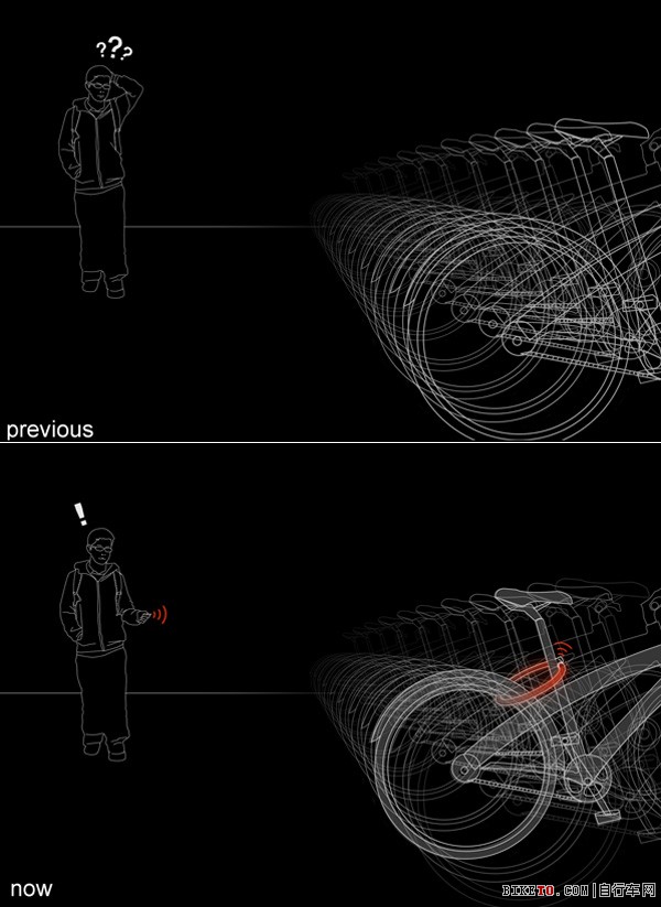 当你在都市里把自行车停下,众多的车海中你真的很难寻觅到你爱车的影踪,为此,设计师Yakun Zhang,Jason LIU 和 Danwei Ye设计了这款自行车定位锁,原理类似于汽车的遥控锁。
