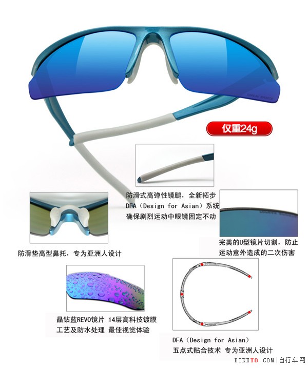 新款TSR701采用了高弹性防滑式镜腿设计,依照亚洲人的脸型,结合自行车及户外运动对运动眼镜的各项要求,通过拓步DFA(Design for Asian)SYSTEM 系统长达6个月实用阶段的测试。