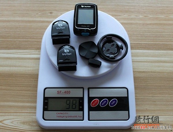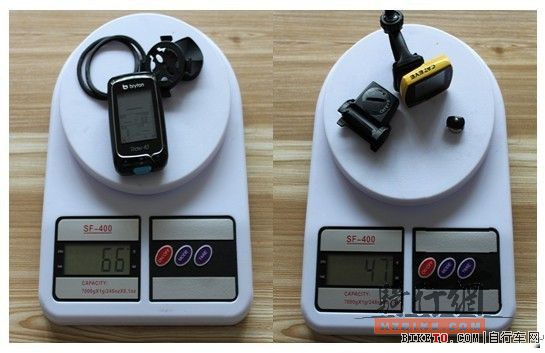 首先,我把Bryton Rider 40和我之前一直在使用的CATEYE RD300W进行了外观上的对比,先是对重量进行了比较,Bryton Rider 40(单表头)重量是66G , CATEYE RD300W的重量是47G 。