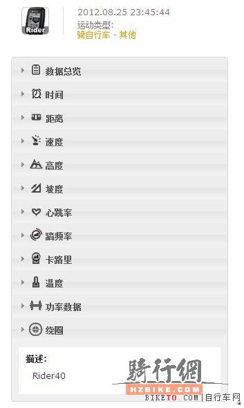 与普通码表一样,所具有的功能这里就不再介绍了,同时Bryton Rider 40通过链接电脑后,你可以返回查看以下各项数据:1、速度、心率、踏频三项数据的极值和平均值;2、当日骑行的总爬升高度和最大爬升高度,通过这个,你就知道你当天爬的最高的山有多高了;3、心率,除了心率的极值和平均值,还有根据自身的设置,查看整个骑行过程中心率在各个区间的分布情况;4、卡路里项目,在这一项里,你可以看到当天骑行所燃烧的卡路里和减少的脂肪,个人觉得这个功能应该比较受需要减肥的车友和女性车友的喜欢。其实在一数据栏里,还有很多功能,但是由于时间和经历问题,我没有去一一研究,只看了比较常用的几项。