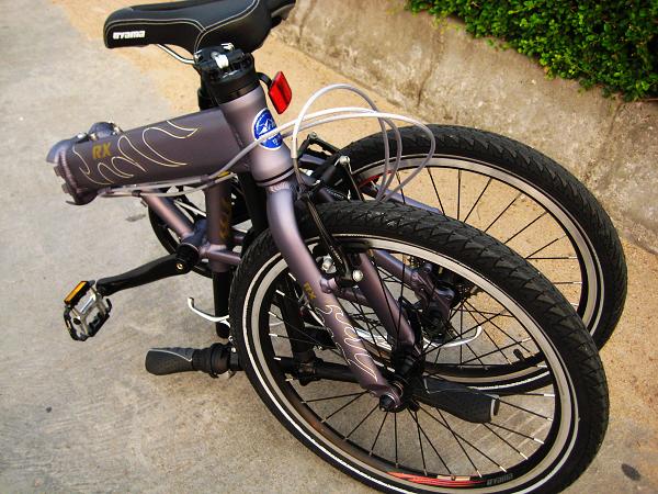 同样,RX1折叠车的前叉和头管同样采用了铝合金材质,轻轻将车身提起来,感觉RX1的头管和座管部位重量比较均衡。