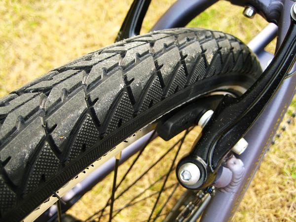 欧亚马 RX1采用了欧亚马自有品牌20英寸轮圈,与大行SP8的尺寸是一样的,20英寸车圈是小轮车、折叠车通用的车圈型号,修补件容易找到,而且价格相对也比较实惠。RX1选用了1.95外胎型号(没看出来是什么品牌),比大行SP8的2.0大苹果外胎稍微细了一点,但牙纹很深,试骑过程中,比较轻快,胎阻较小,抓地性比较好,但舒适性比大行的大苹果胎有差一些。